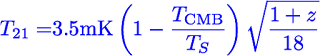 The quantity directly relevant for the 21cm absorption signal is the so-called spin temperature Ts, which is a measure of the relative occupation number of the singlet and triplet hydrogen states. Just before the cosmic dawn, the spin temperature equals the CMB one, and as a result there is no net absorption or emission of 21cm photons. However, it is believed that the light from the first stars initially lowers the spin temperature down to the hydrogen one. Therefore, there should be absorption of 21cm CMB photons by the hydrogen in the epoch between z~20 and z~15. After taking into account the cosmological redshift, one should now observe a dip in the radio frequencies between 70 and 90 MHz. This is roughly what EDGES finds. The depth of the dip is described by the formula: